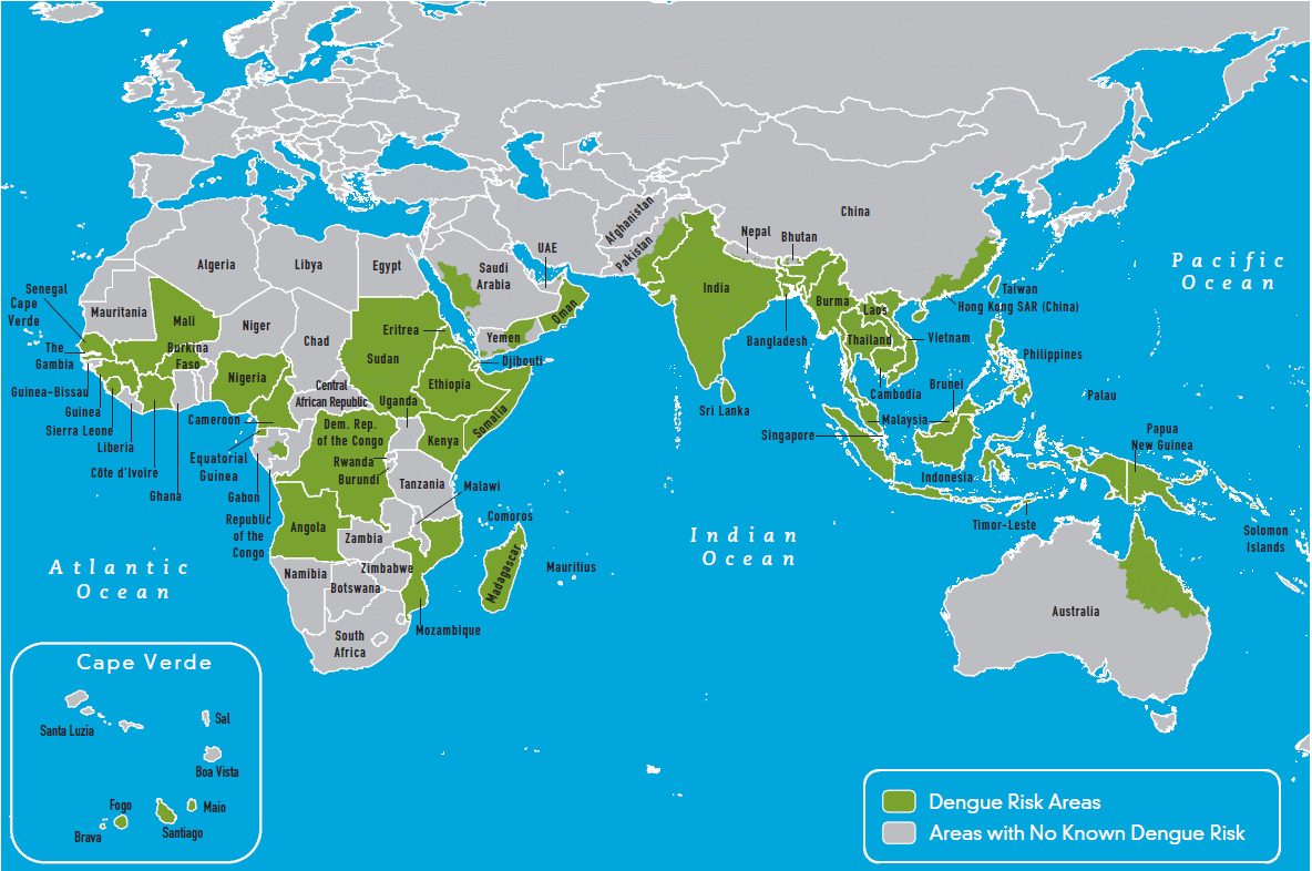 If you are traveling to a tropical or sub-tropical area (Africa, Asia, Caribbean, Central and South America), you can protect yourself from dengue and other mosquito-borne diseases by following the suggestions on our Prevention page, including using insect repellent. You can get more information about Traveler's Health from CDC - Areas with Risk of Dengue.