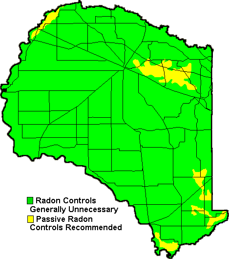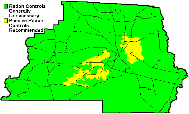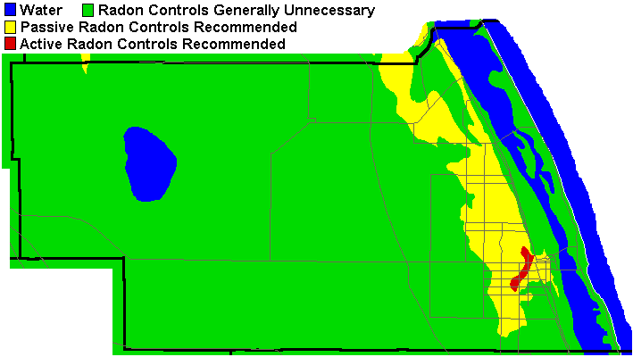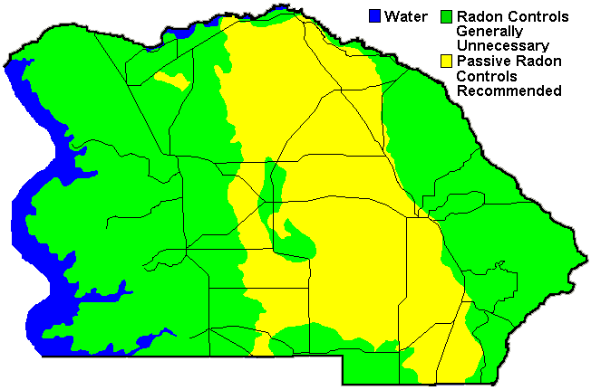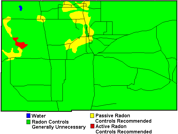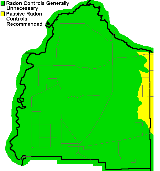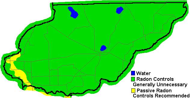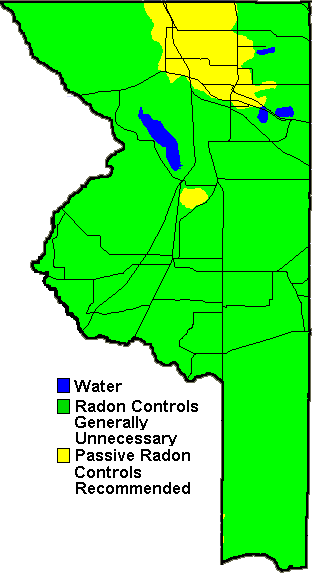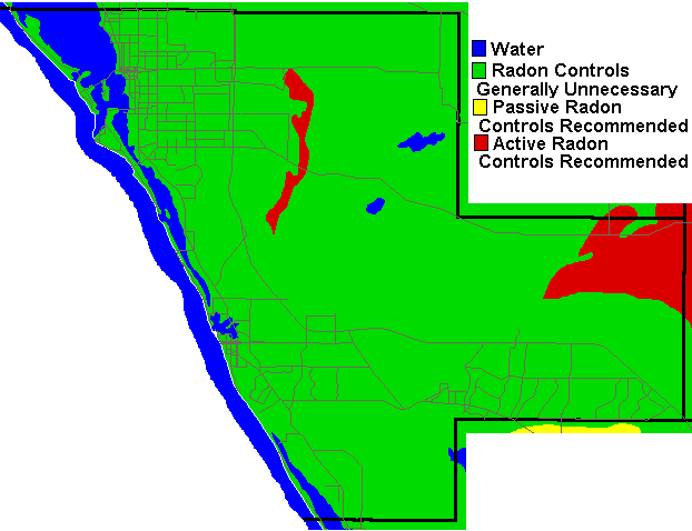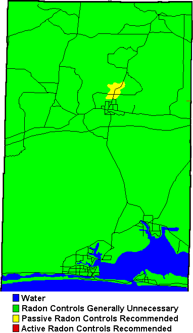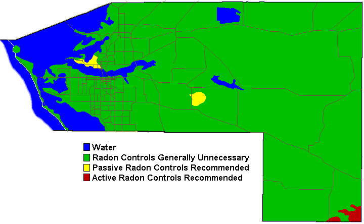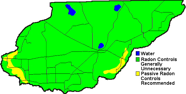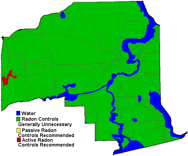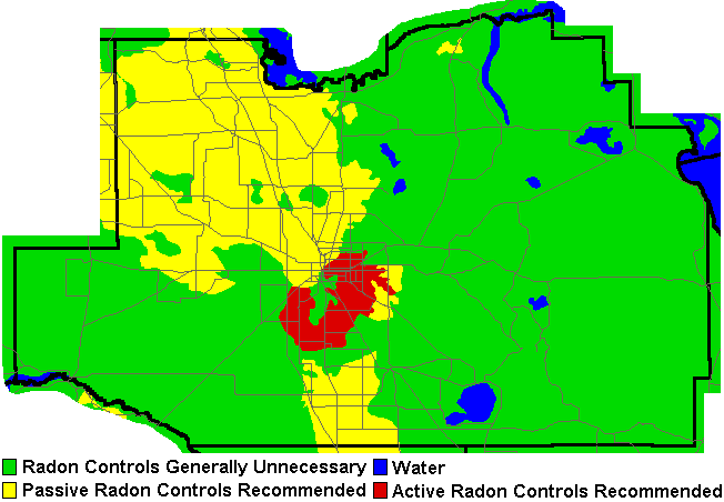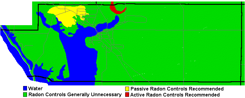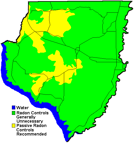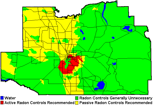 The maps linked below are color coded. Red areas are zones where active radon control is recommended (ARC). Yellow areas are zones where passive radon control is recommended (PRC). Finally, green areas are zones where radon control is generally unnecessary (RCU).