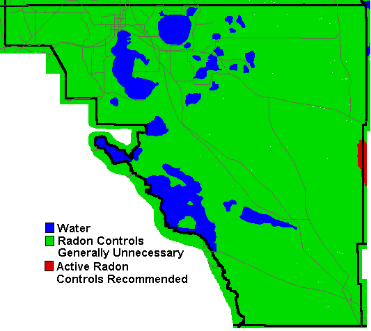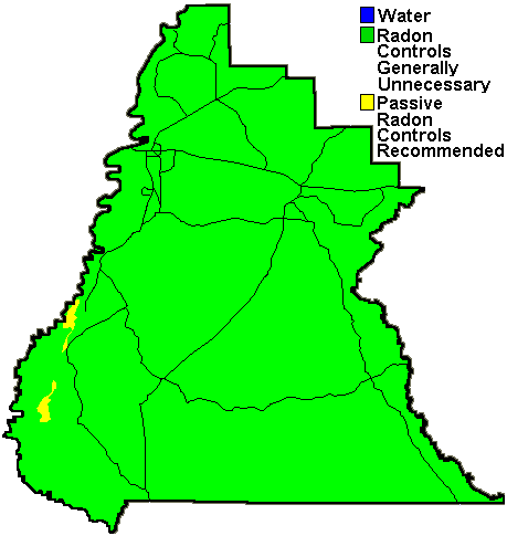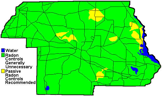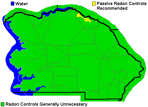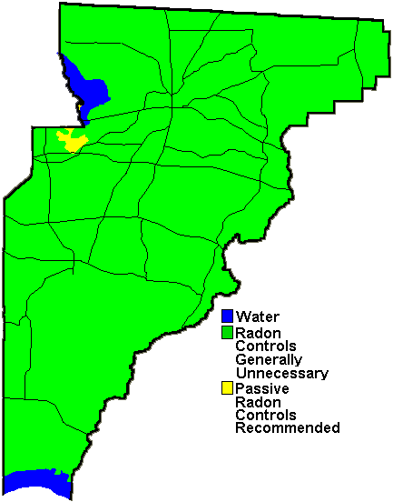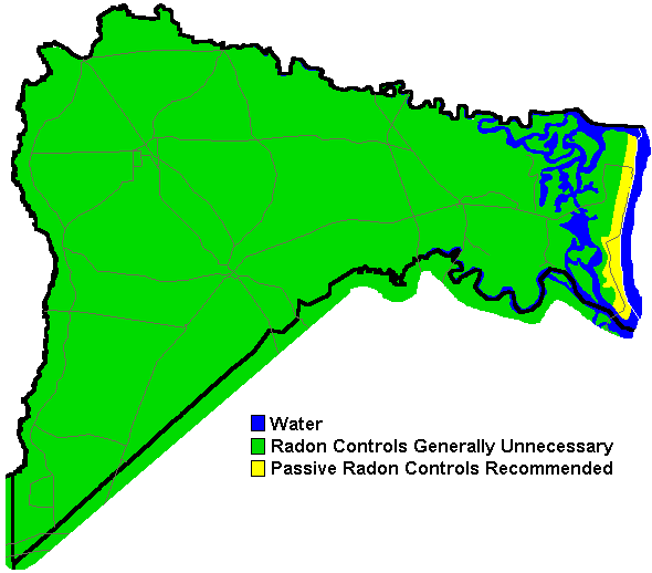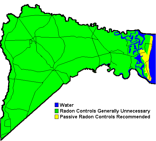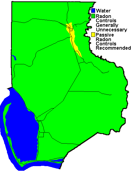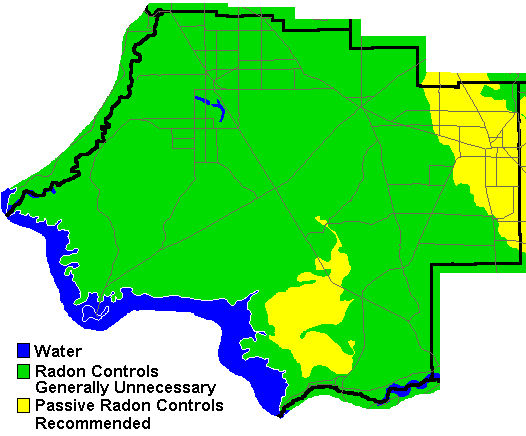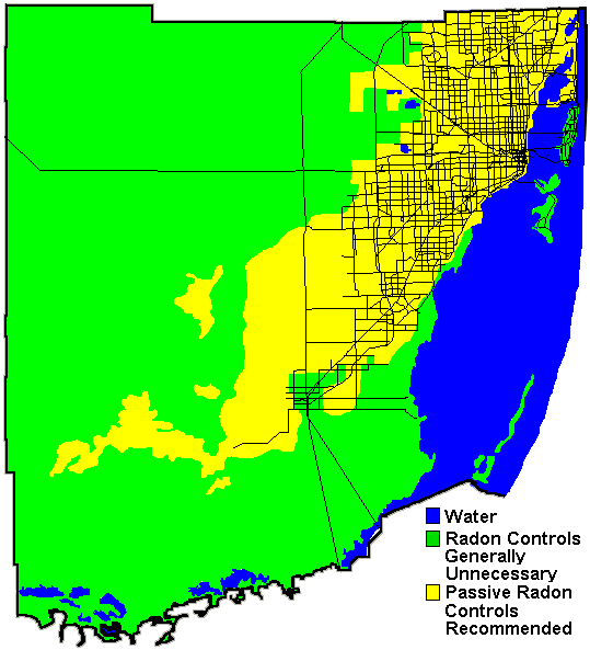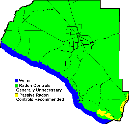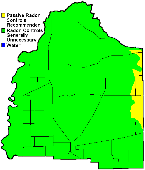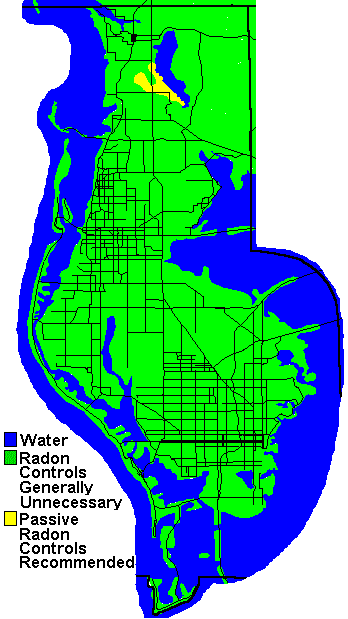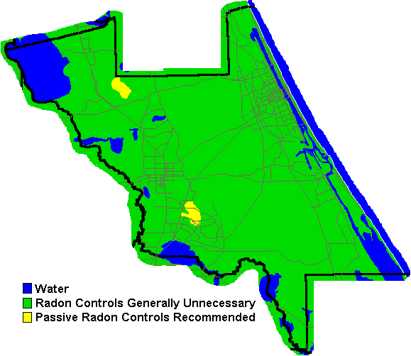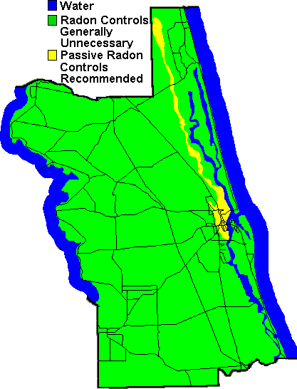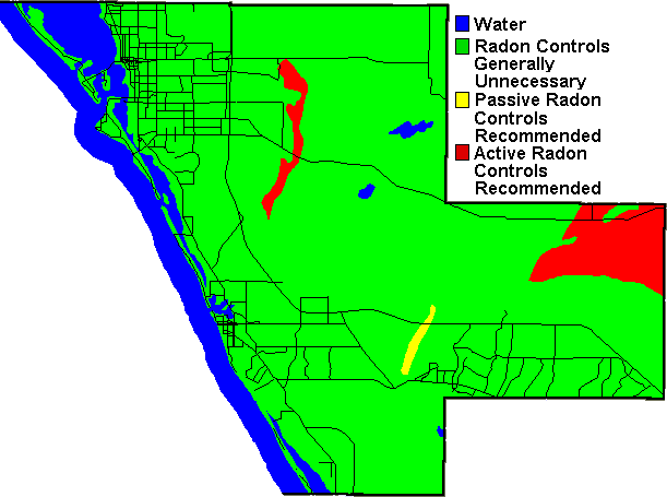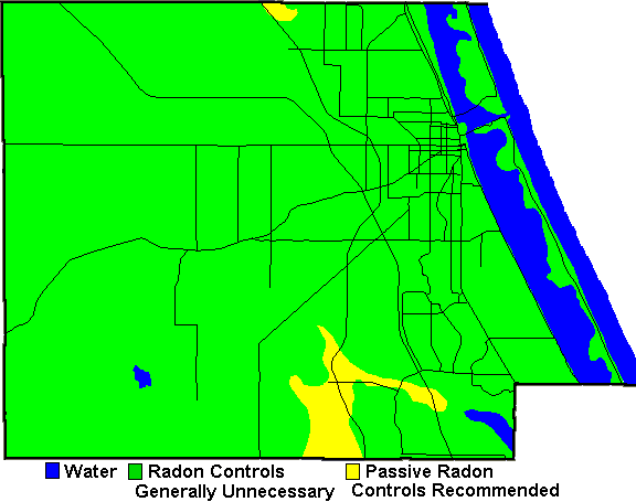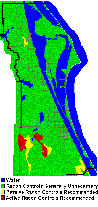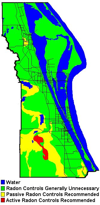 You may examine separately the Department of Business and Professional Regulation (Formerly within the Department of Community Affairs) radon protection maps by county for large buildings and for single family homes and duplexes (residences). These maps describe the areas of the state where added radon resistant measures beyond the current energy efficient building code are needed to prevent indoor radon problems. Currently these standards are voluntary. It would take a majority of the building permit issuing agencies in any county to adopt them for the standards to become a require code within that county. Only those counties that have areas where added radon resistant features are recommended have maps.